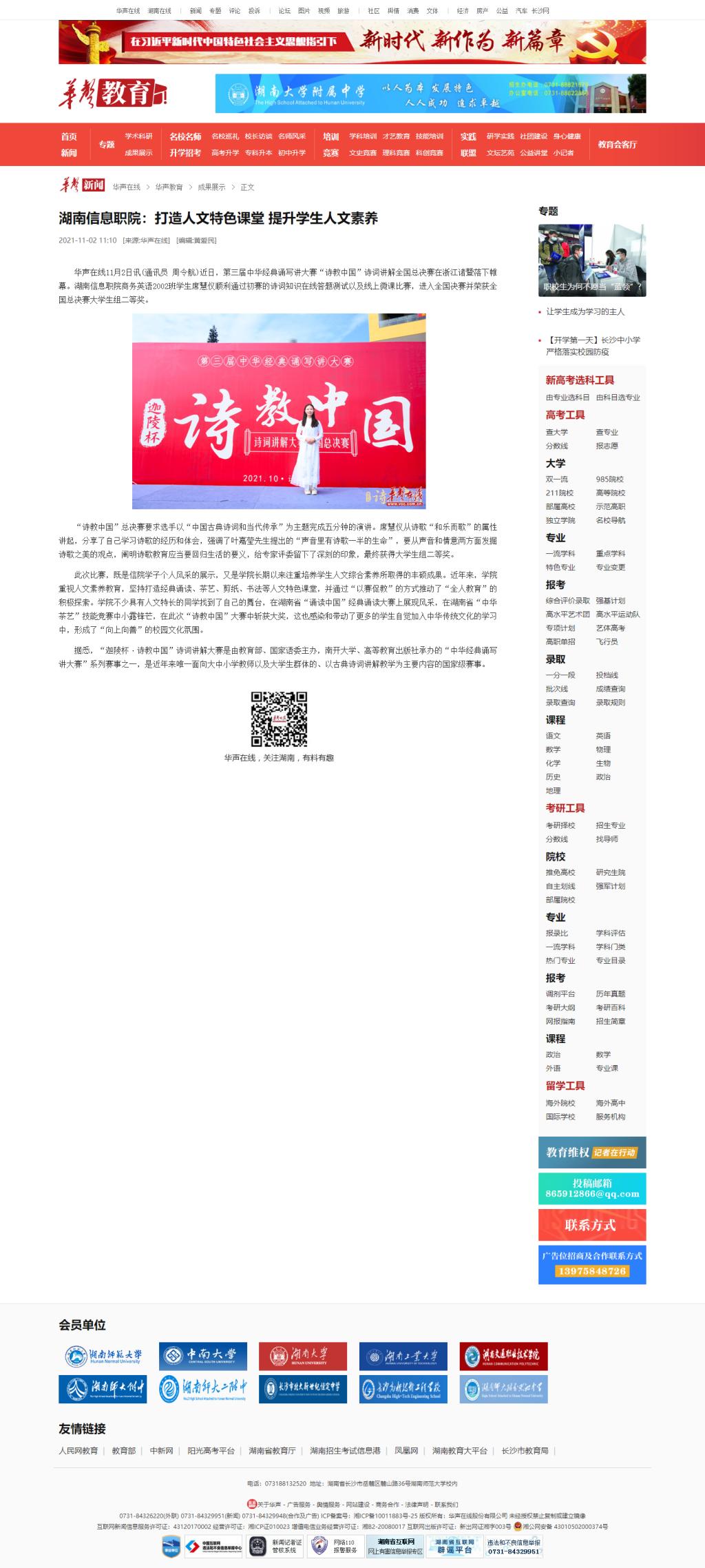 11月2日,华声在线发布《湖南信息职院:打造人文特色课堂 提升学生人文素养》。