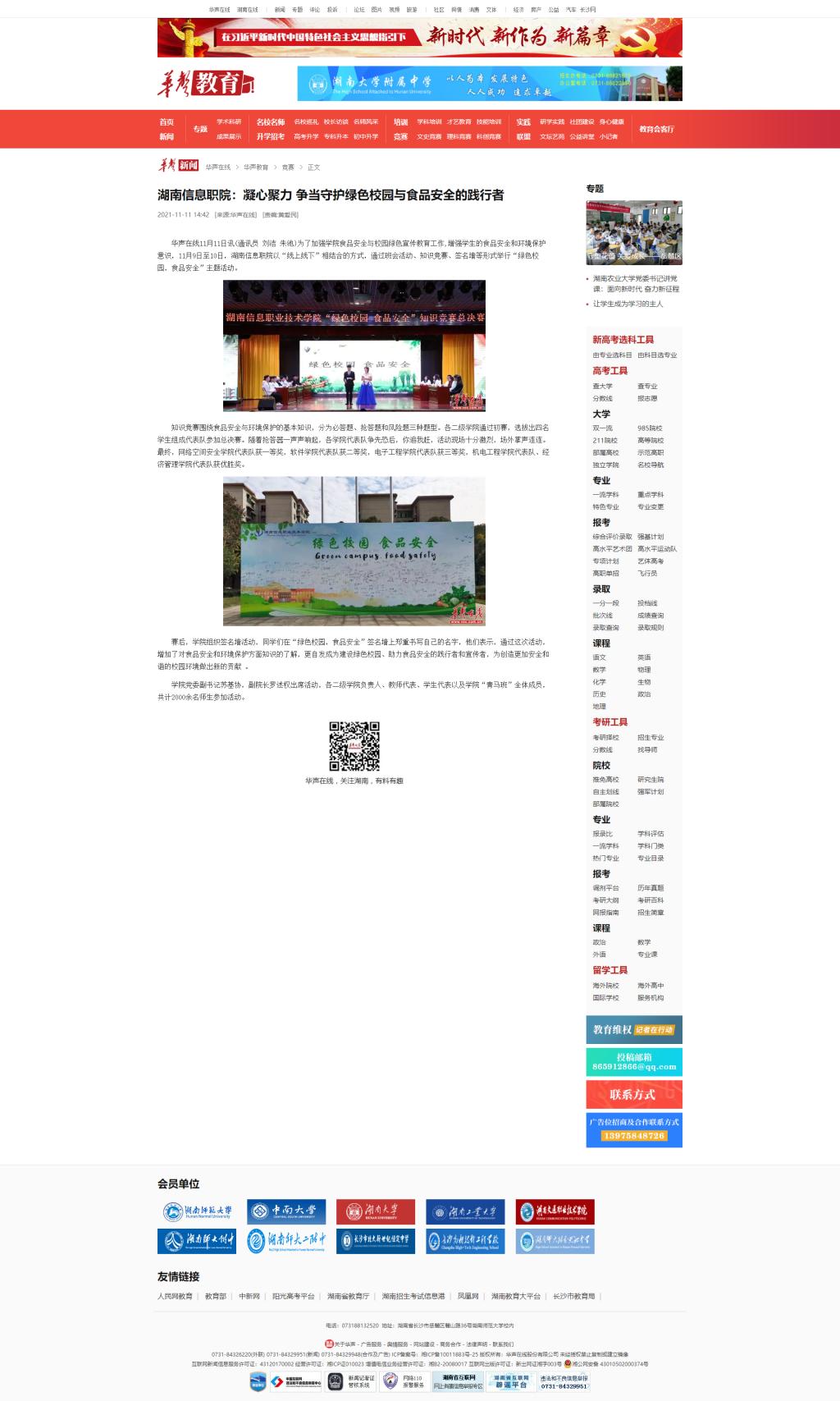 11月11日,华声在线发布《湖南信息职院:凝心聚力 争当守护绿色校园与食品安全的践行者》。