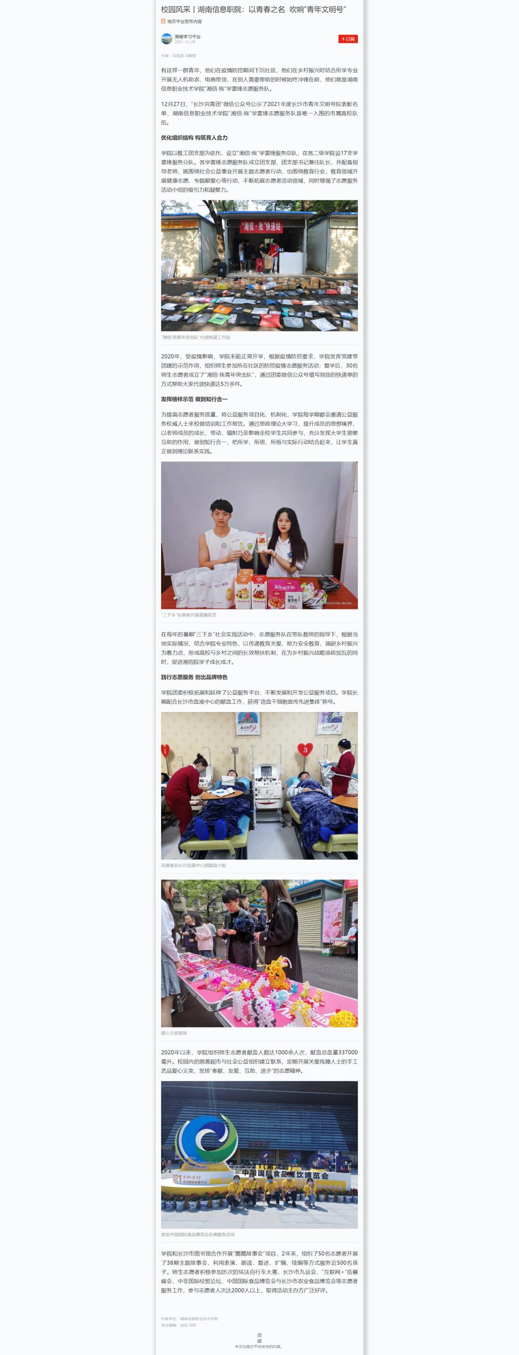 12月28日,学习强国发布《校园风采丨湖南信息职院:以青春之名吹响“青年文明号”》。