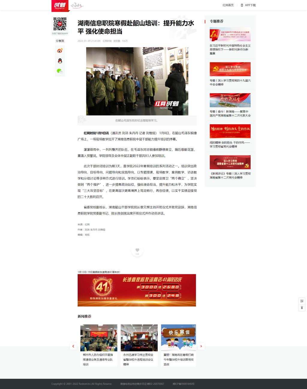 1月9日,红网时刻发布《湖南信息职院寒假赴韶山培训:提升能力水平强化使命担当》。