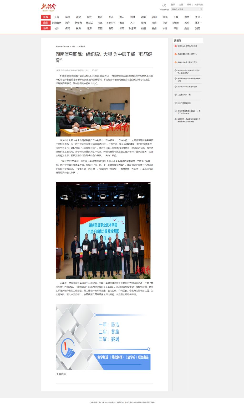 1月11日,新湖南发布《湖南信息职院:组织培训大餐为中层干部“强筋健骨”》。