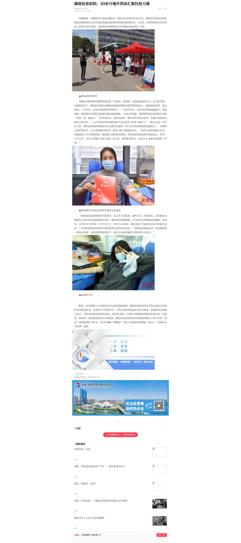 4月1日,新湖南发布《湖南信息职院:20余万毫升热血汇聚抗疫力量》