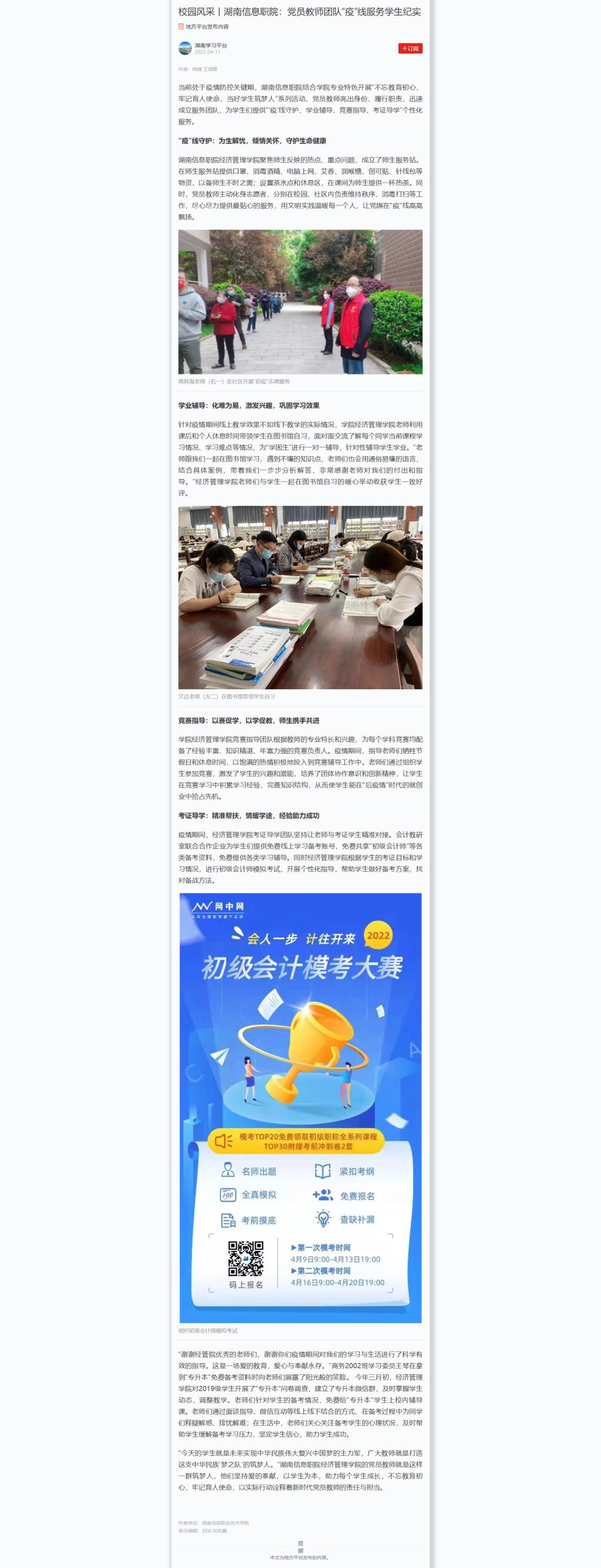 4月11日,学习强国发布《校园风采丨湖南信息职院:党员教师团队“疫”线服务学生纪实》
