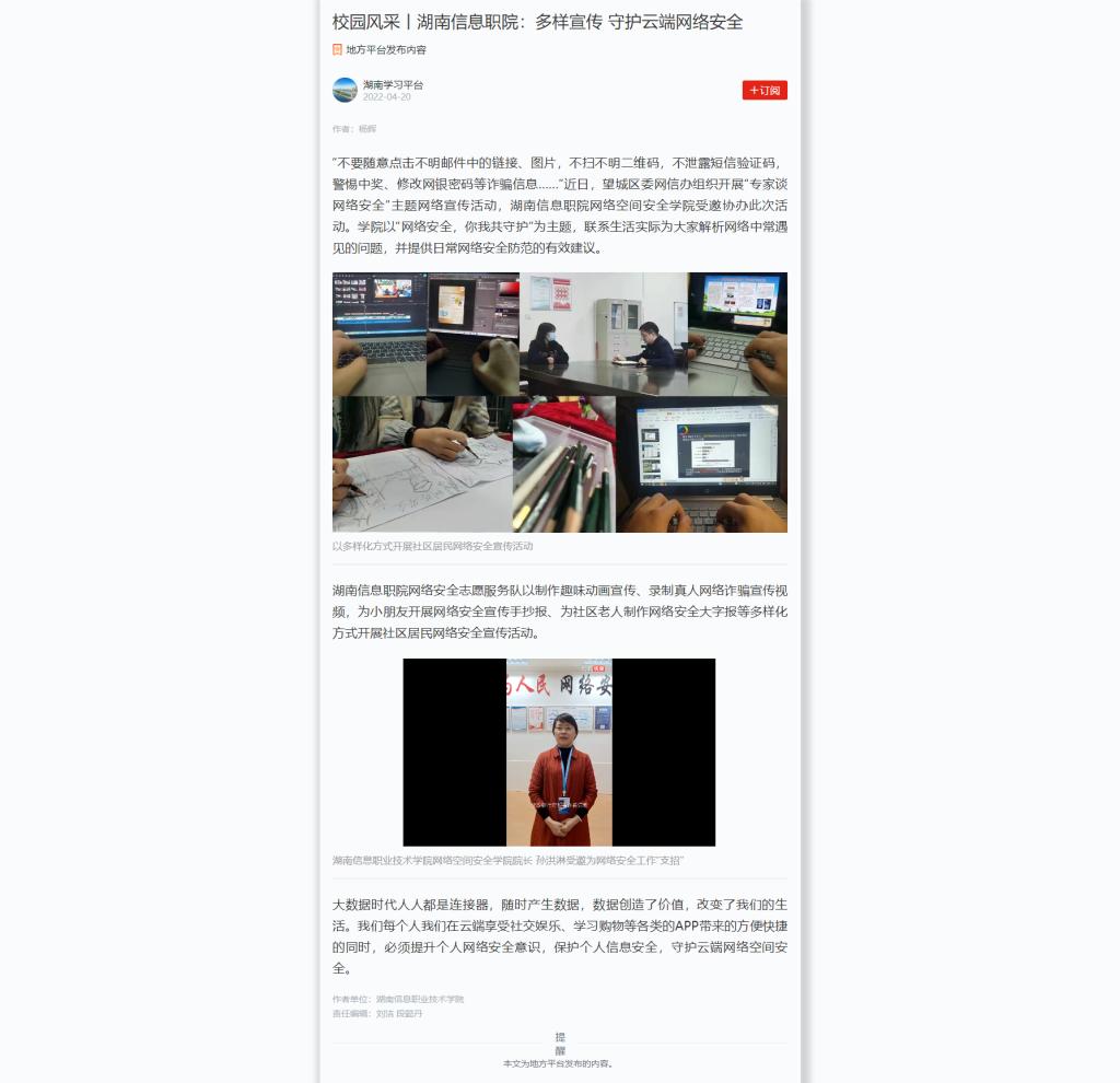 4月20日,学习强国发布《校园风采丨湖南信息职院:多样宣传 守护云端网络安全》