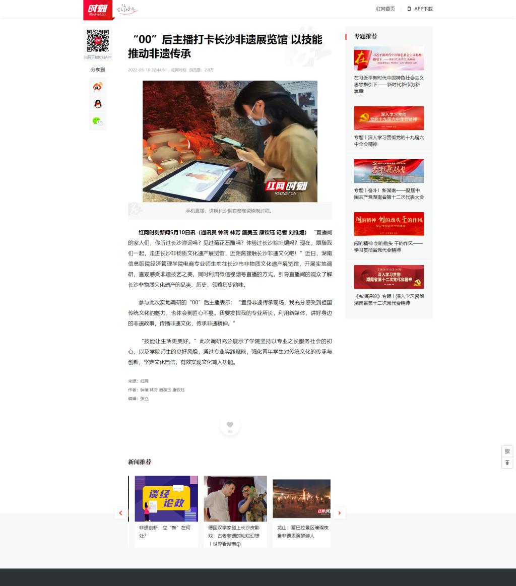 5月10日,红网时刻发布《“00”后主播打卡长沙非遗展览馆 以技能推动非遗传承》