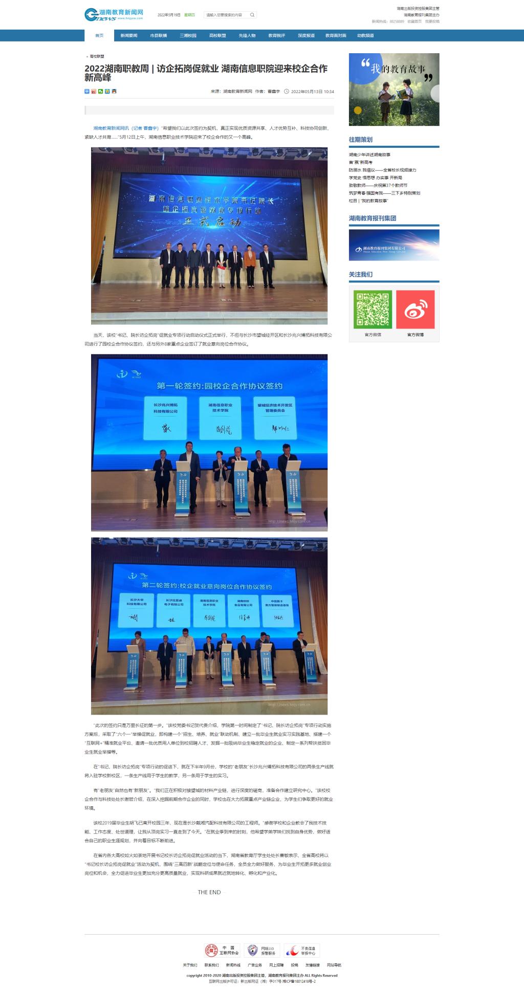 5月13日,湖南教育新闻网发布《2022湖南职教周|访企拓岗促就业 湖南信息职院迎来校企合作新高峰》