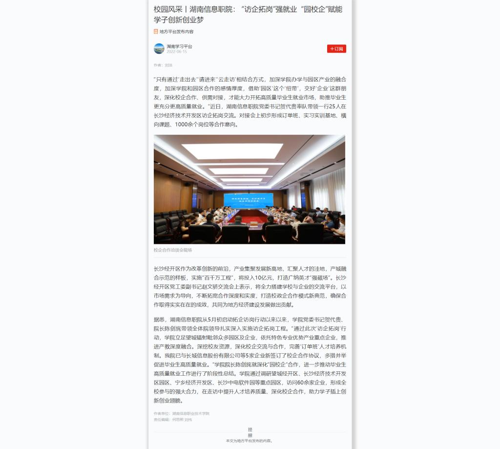 6月15日,学习强国发布《校园风采丨湖南信息职院:“访企拓岗”强就业“园校企”赋能学子创新创业梦》