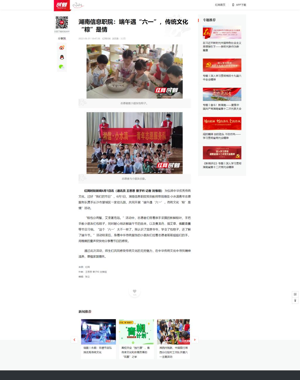6月1日,红网时刻发布《湖南信息职院:端午遇“六一”,传统文化“粽”是情》