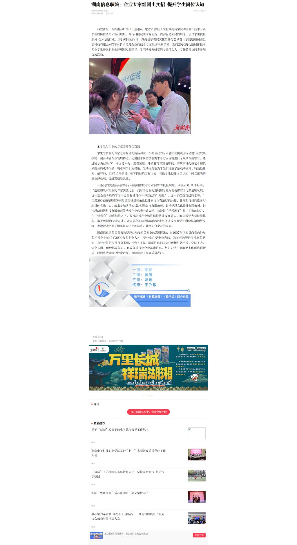 6月25日,新湖南发布《湖南信息职院:企业专家组团出实招 提升学生岗位认知》