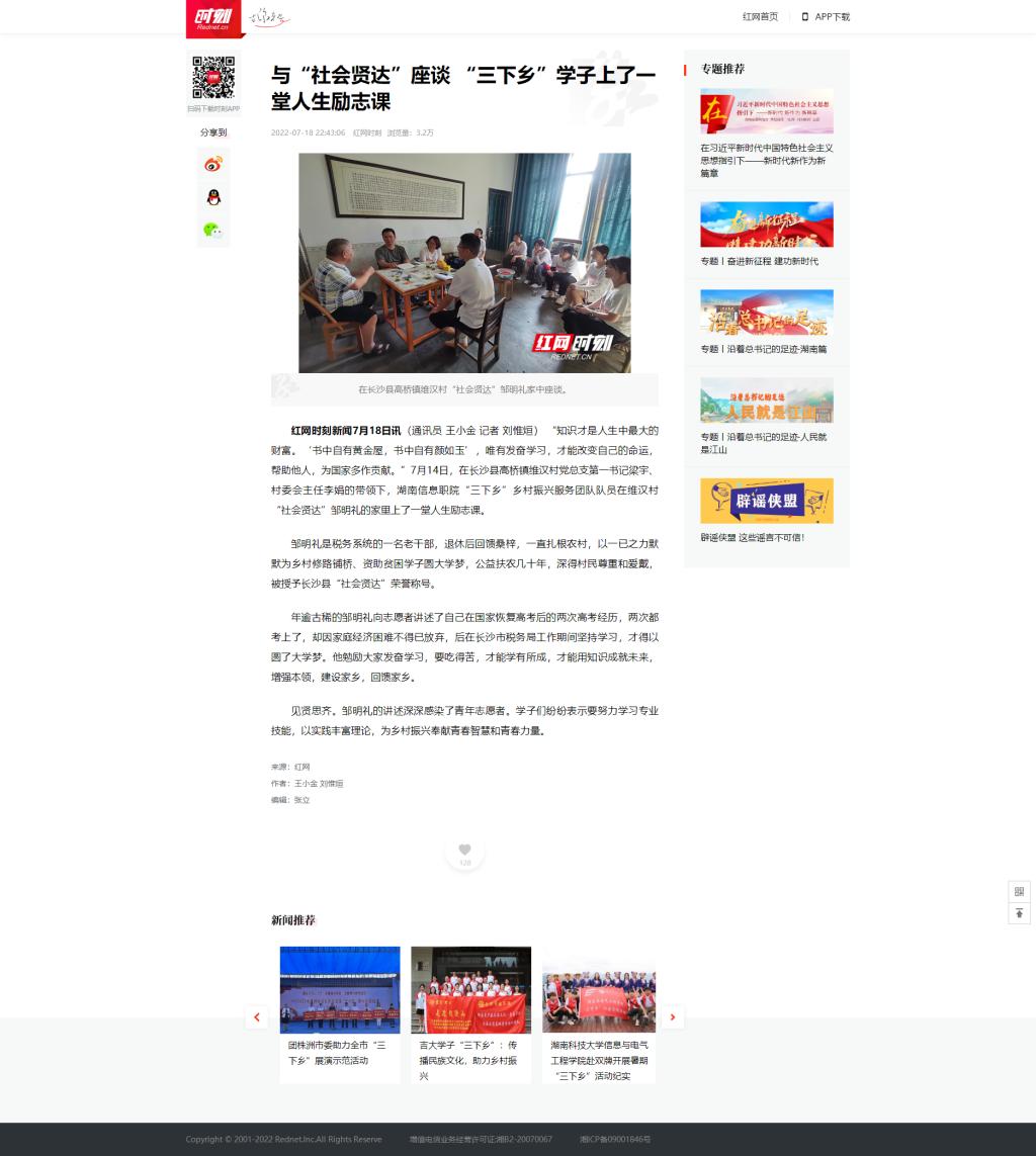 7月18日,红网时刻发布《与“社会贤达”座谈 “三下乡”学子上了一堂人生励志课》