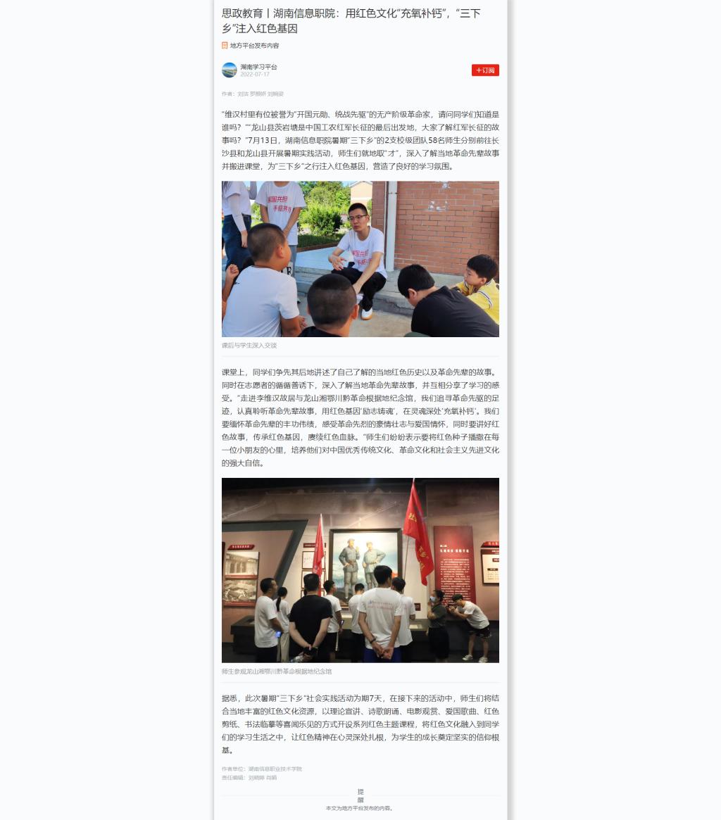 7月17日,学习强国发布《思政教育丨湖南信息职院:用红色文化“充氧补钙”,“三下乡”注入红色基因》