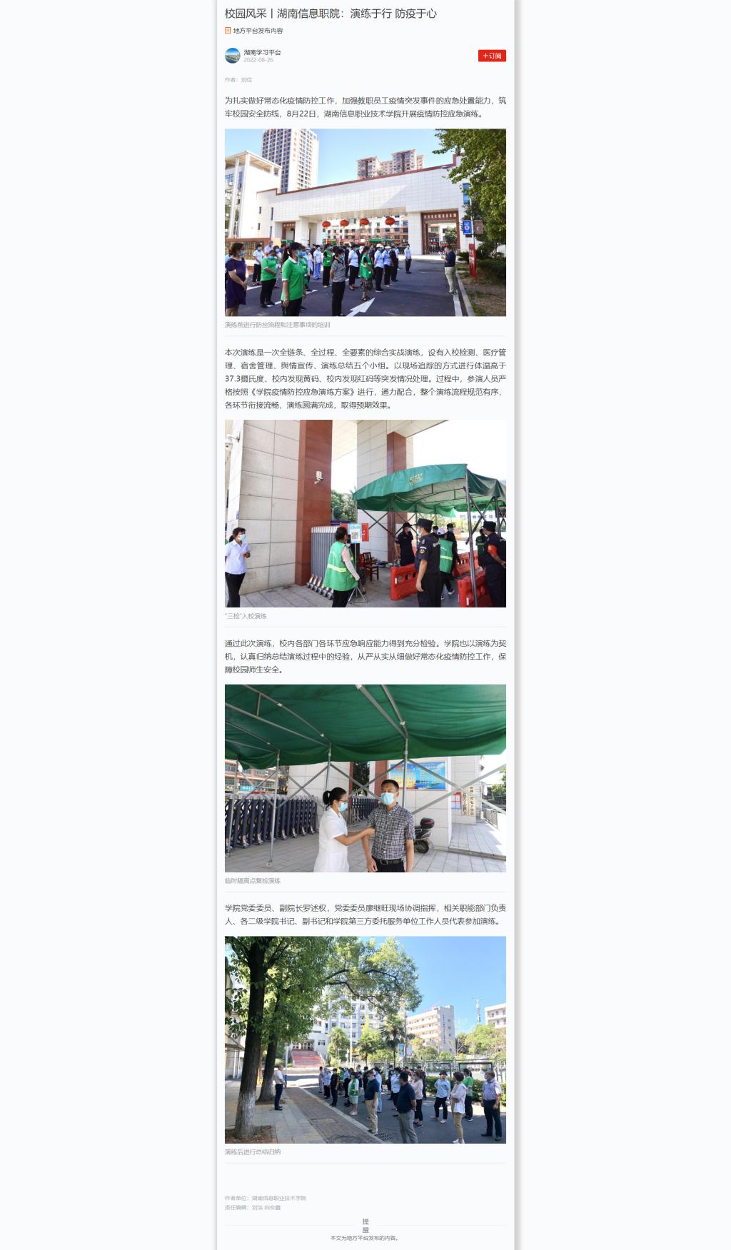 8月26日,学习强国发布《校园风采丨湖南信息职院:演练于行 防疫于心》