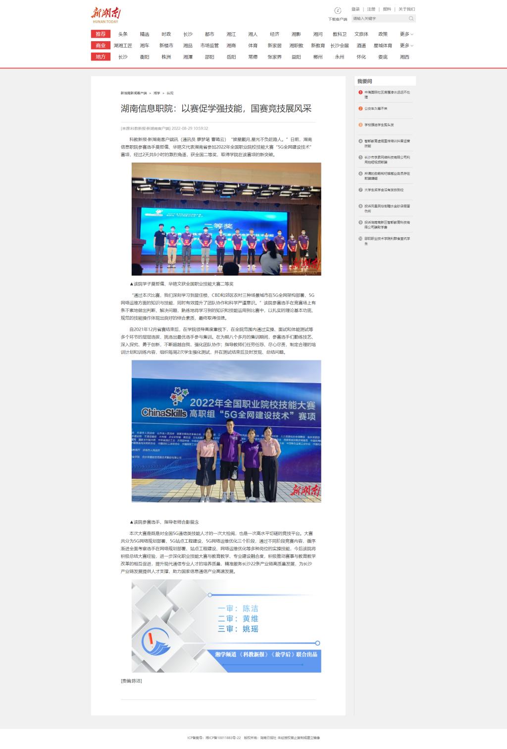8月29日,新湖南发布《湖南信息职院:以赛促学强技能,国赛竞技展风采》