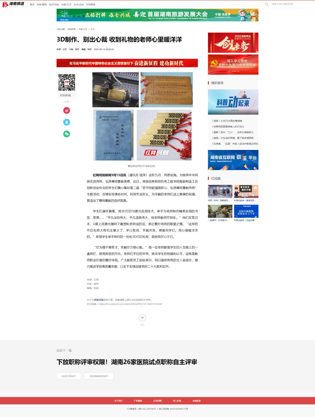 9月13日,红网时刻发布《3D制作、别出心裁 收到礼物的老师心里暖洋洋》