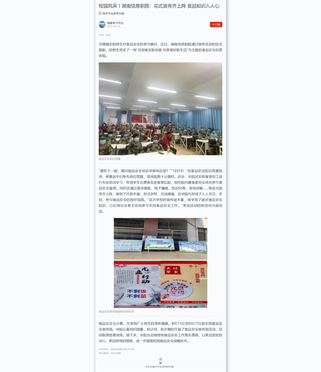 9月28日,学习强国发布《校园风采丨湖南信息职院:花式宣传齐上阵 食品知识入人心》