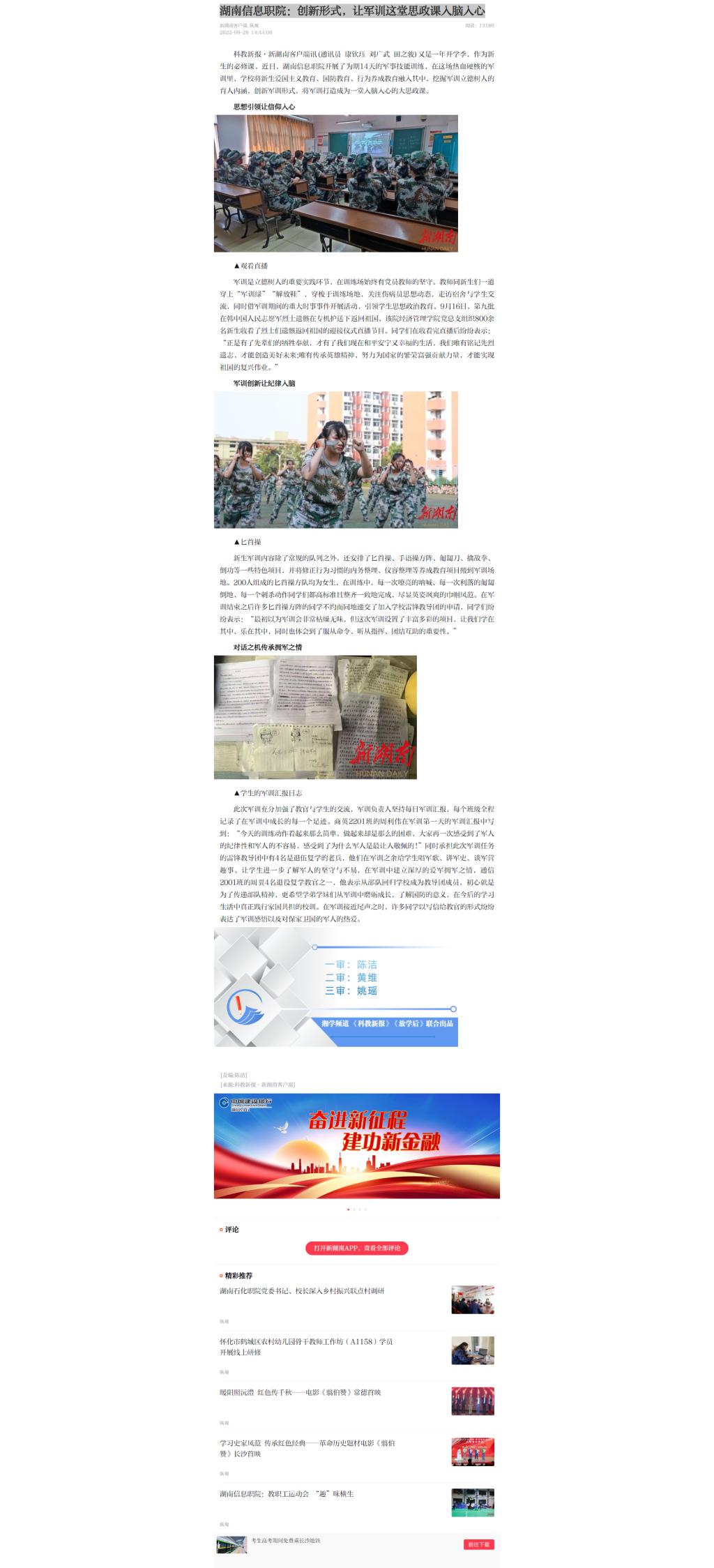 9月29日,新湖南发布《湖南信息职院:创新形式,让军训这堂思政课入脑入心》