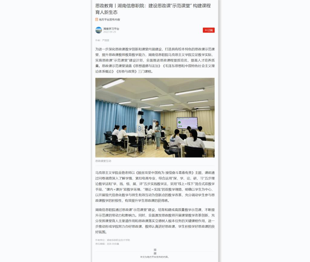 9月29日,学习强国发布《思政教育丨湖南信息职院:建设思政课“示范课堂” 构建课程育人新生态》