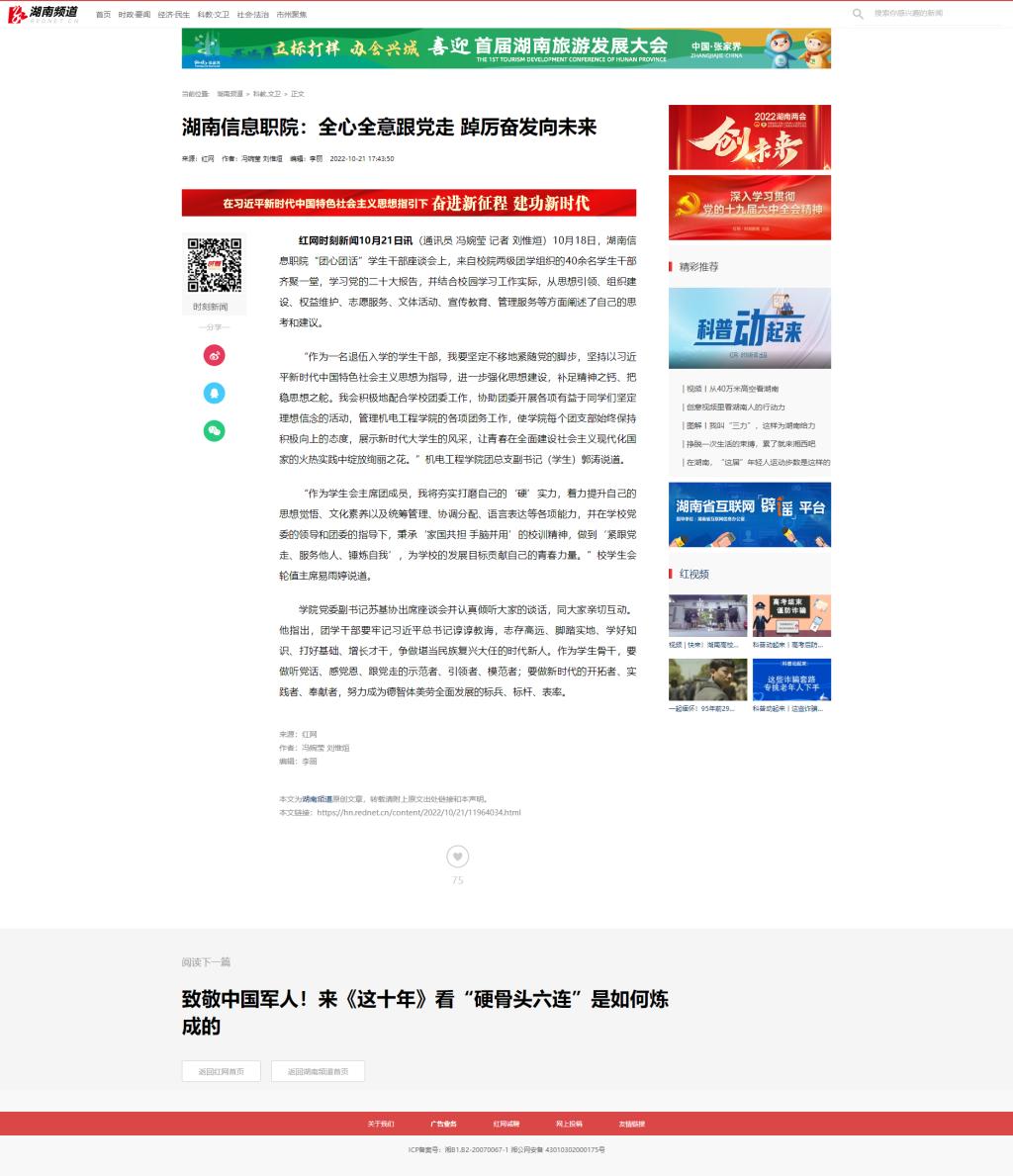10月21日,红网时刻发布《湖南信息职院:全心全意跟党走 踔厉奋发向未来》
