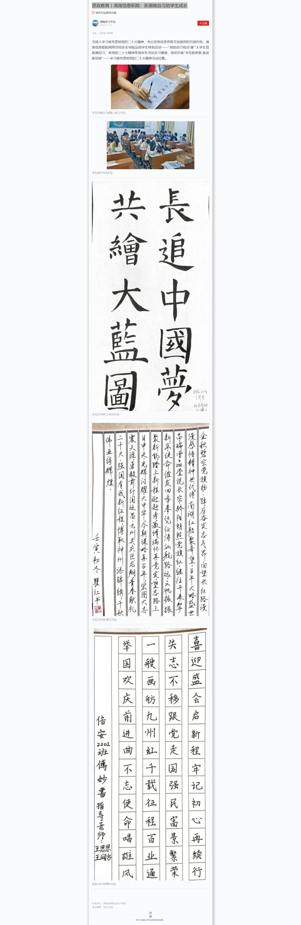 11月23日,学习强国发布《思政教育丨湖南信息职院:新潮晚自习助学生成长》