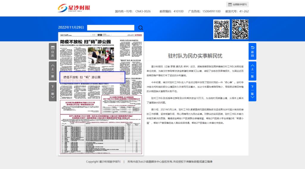 11月29日,星沙时报发布《驻村队为民办实事解民忧》