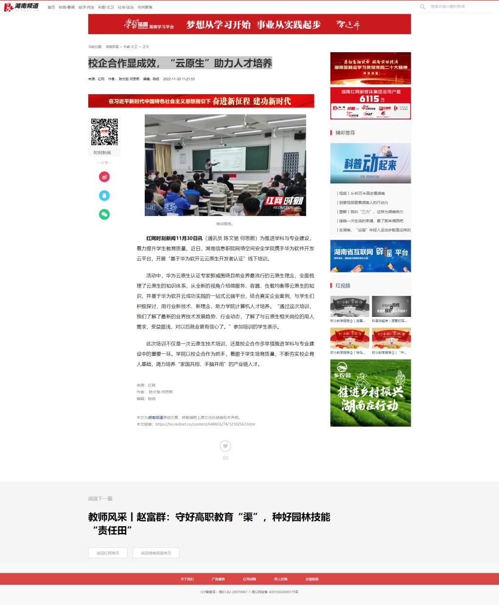 11月30日,红网发布《校企合作显成效,“云原生”助力人才培养》