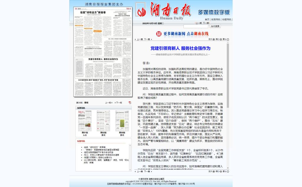 12月13日,湖南日报发布《党建引领育新人 服务社会强作为——beat365官方网站职业教育发展改革成果巡礼之一》