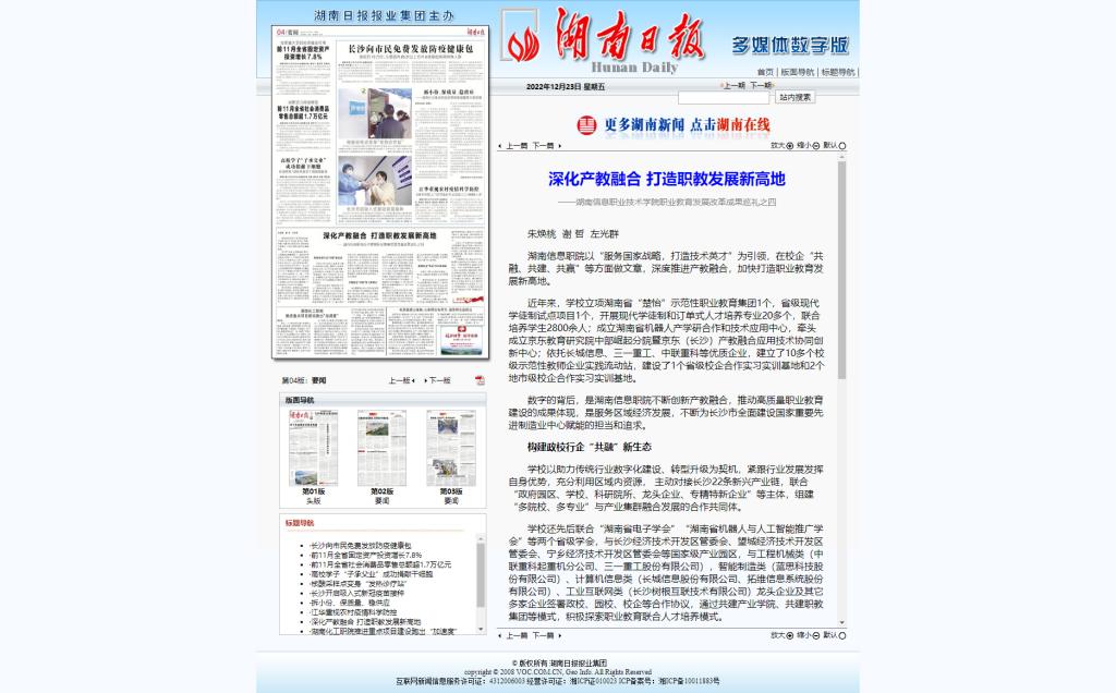 12月23日,湖南日报发布《深化产教融合 打造职教发展新高地——beat365官方网站职业教育发展改革成果巡礼之四》