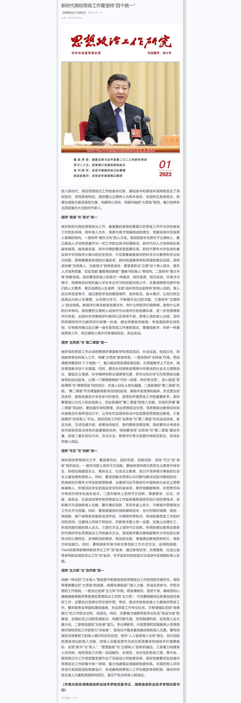 1月13日,学习强国发布《新时代高校思政工作要坚持“四个统一”》