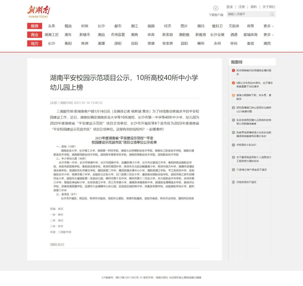 1月16日,新湖南发布《湖南平安校园示范项目公示,10所高校40 所中小学幼儿园上榜》