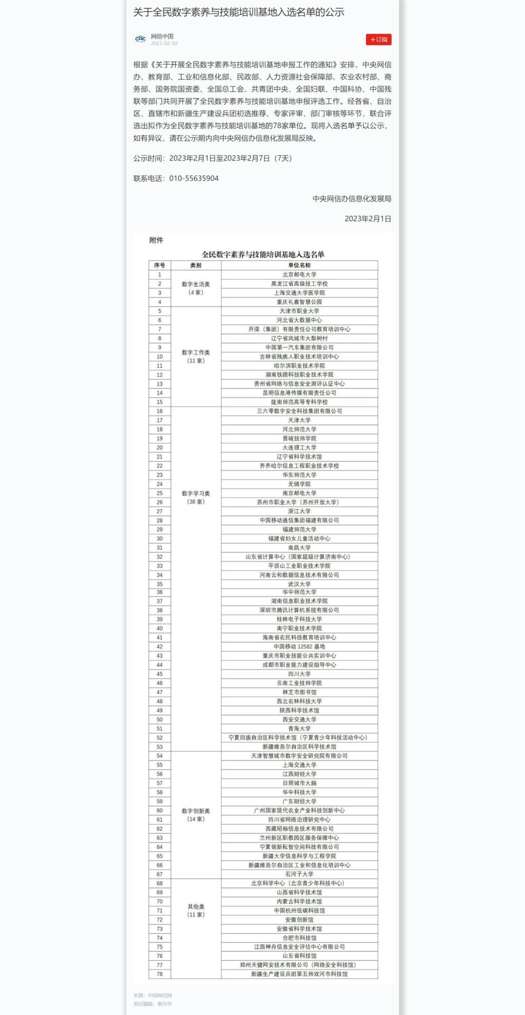 2月2日,学习强国发布《关于全民数字素养与技能培训基地入选名单的公示》
