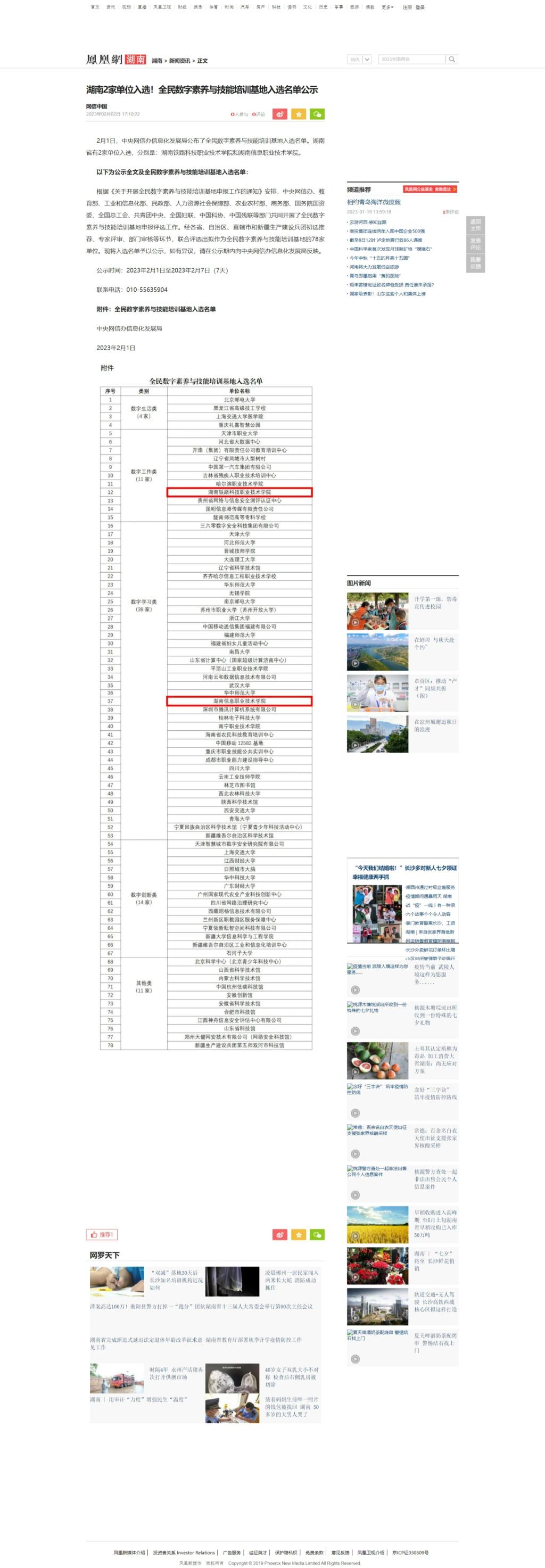 2月2日,凤凰网发布《湖南2家单位入选!全民数字素养与技能培训基地入选名单公示》