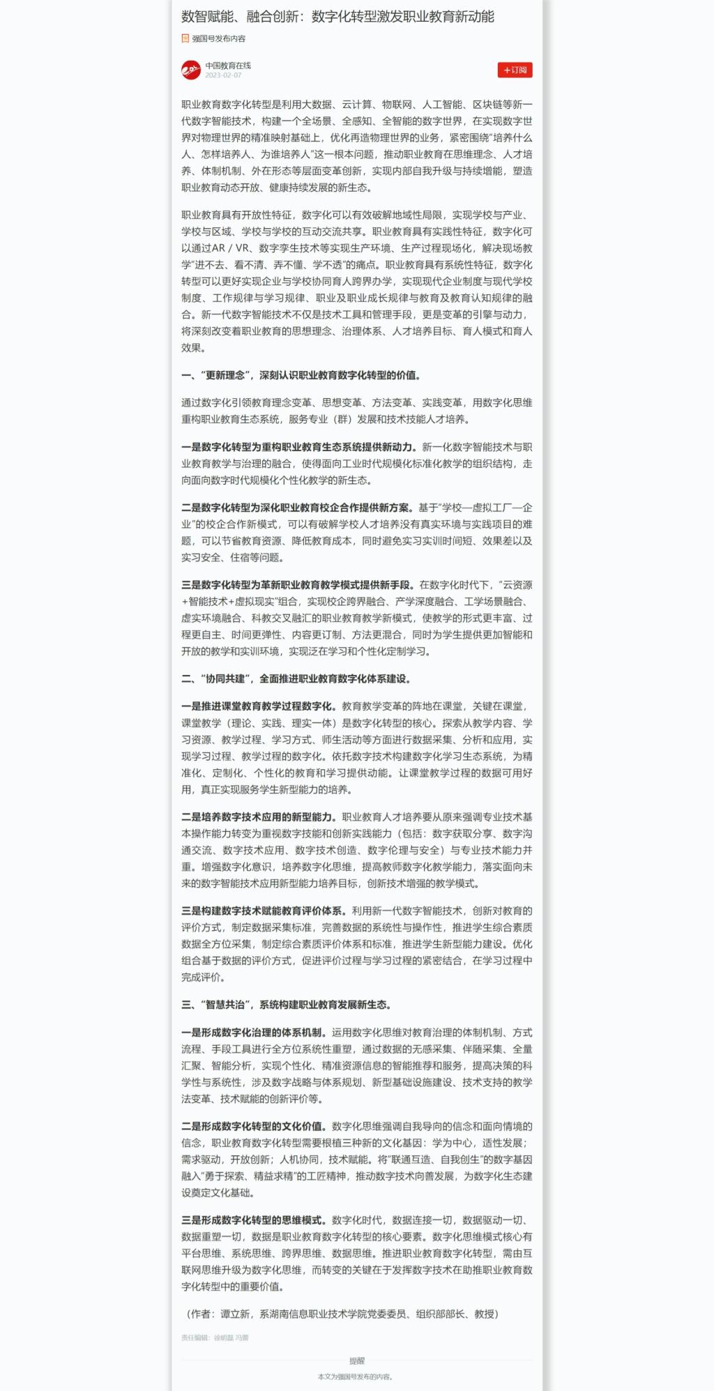 2月7日,学习强国发布《数智赋能、融合创新:数字化转型激发职业教育新动能》