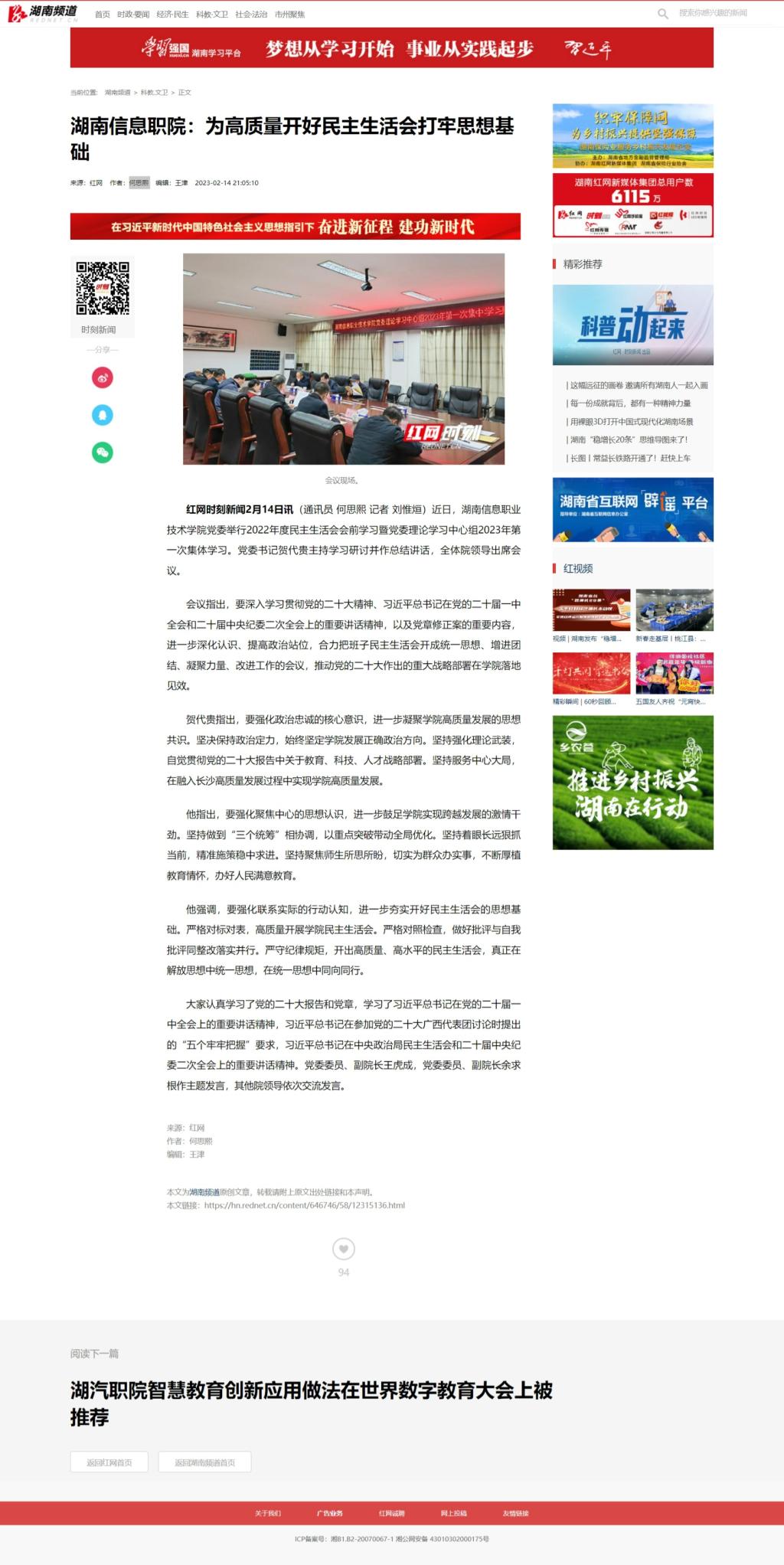 2月14日,红网发布《湖南信息职院:为高质量开好民主生活会打牢思想基础》