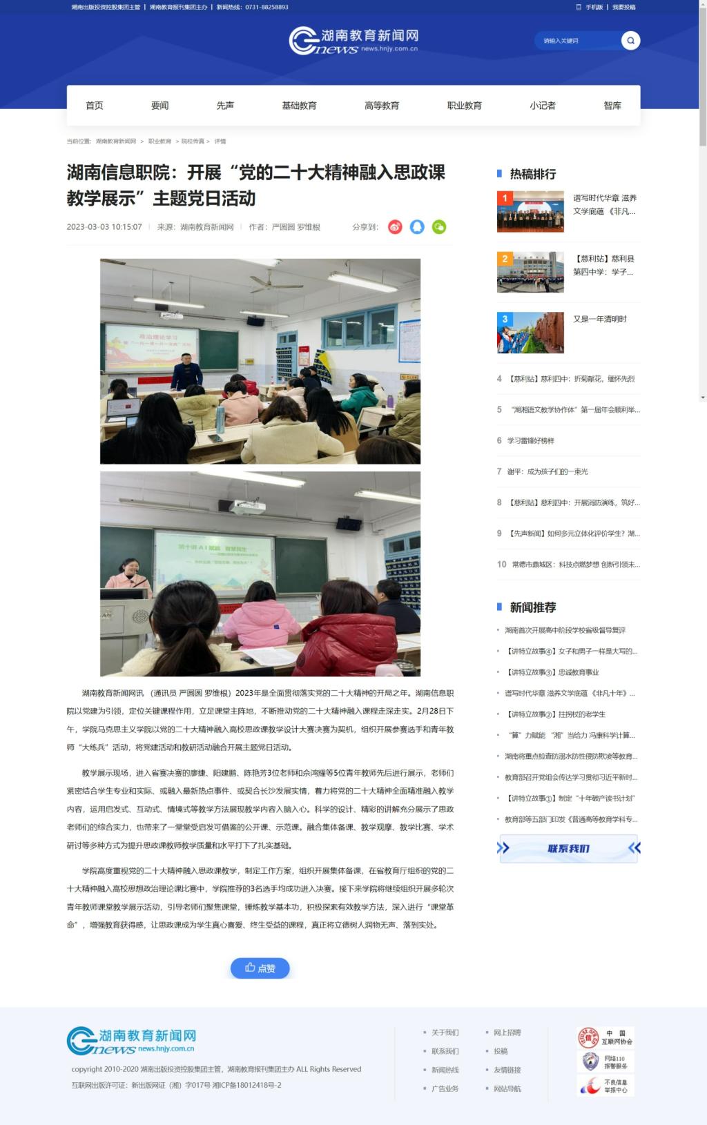 3月3日,湖南教育新闻网发布《湖南信息职院:开展“党的二十大精神融入思政课教学展示”主题党日活动》