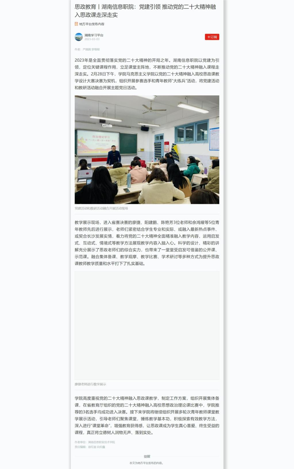 3月3日,学习强国发布《思政教育丨湖南信息职院:党建引领 推动党的二十大精神融入思政课走深走实》