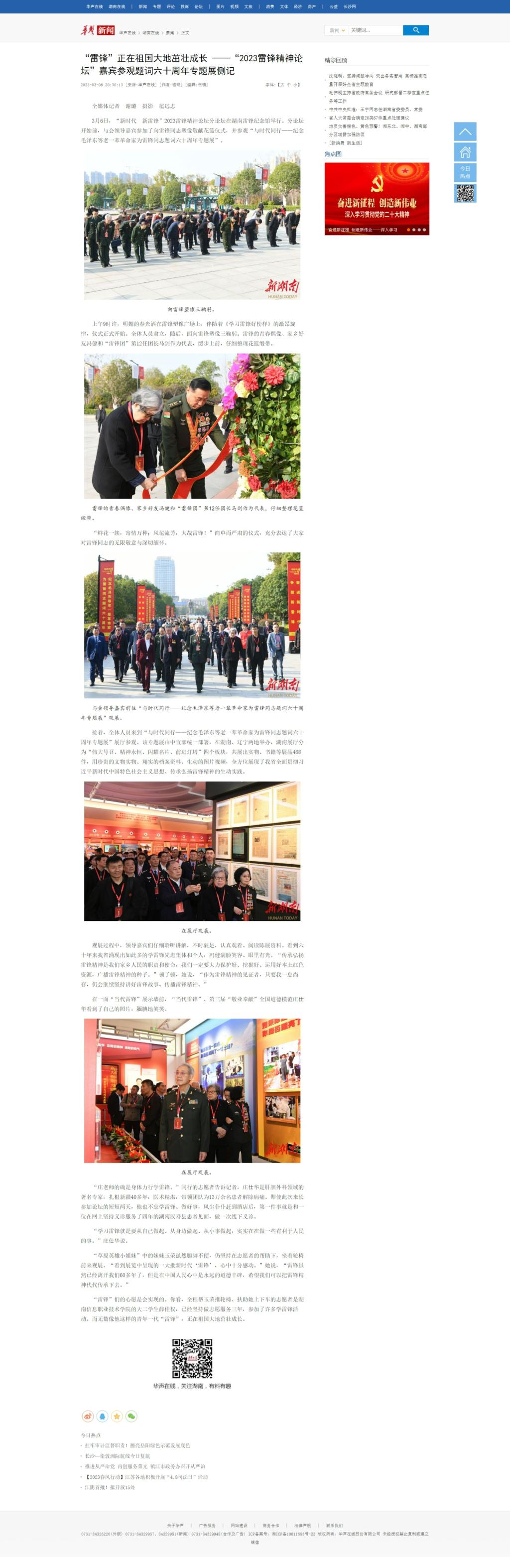 3月6日,华声在线发布《“雷锋”正在祖国大地茁壮成长 ——“2023雷锋精神论坛”嘉宾参观题词六十周年专题展侧记》