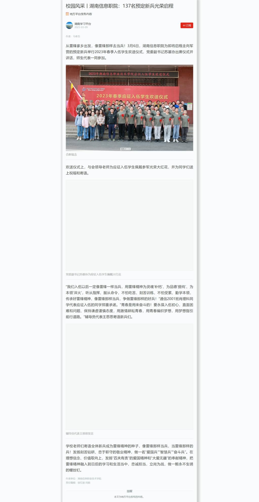 3月9日,学习强国发布《校园风采丨湖南信息职院:137名预定新兵光荣启程》