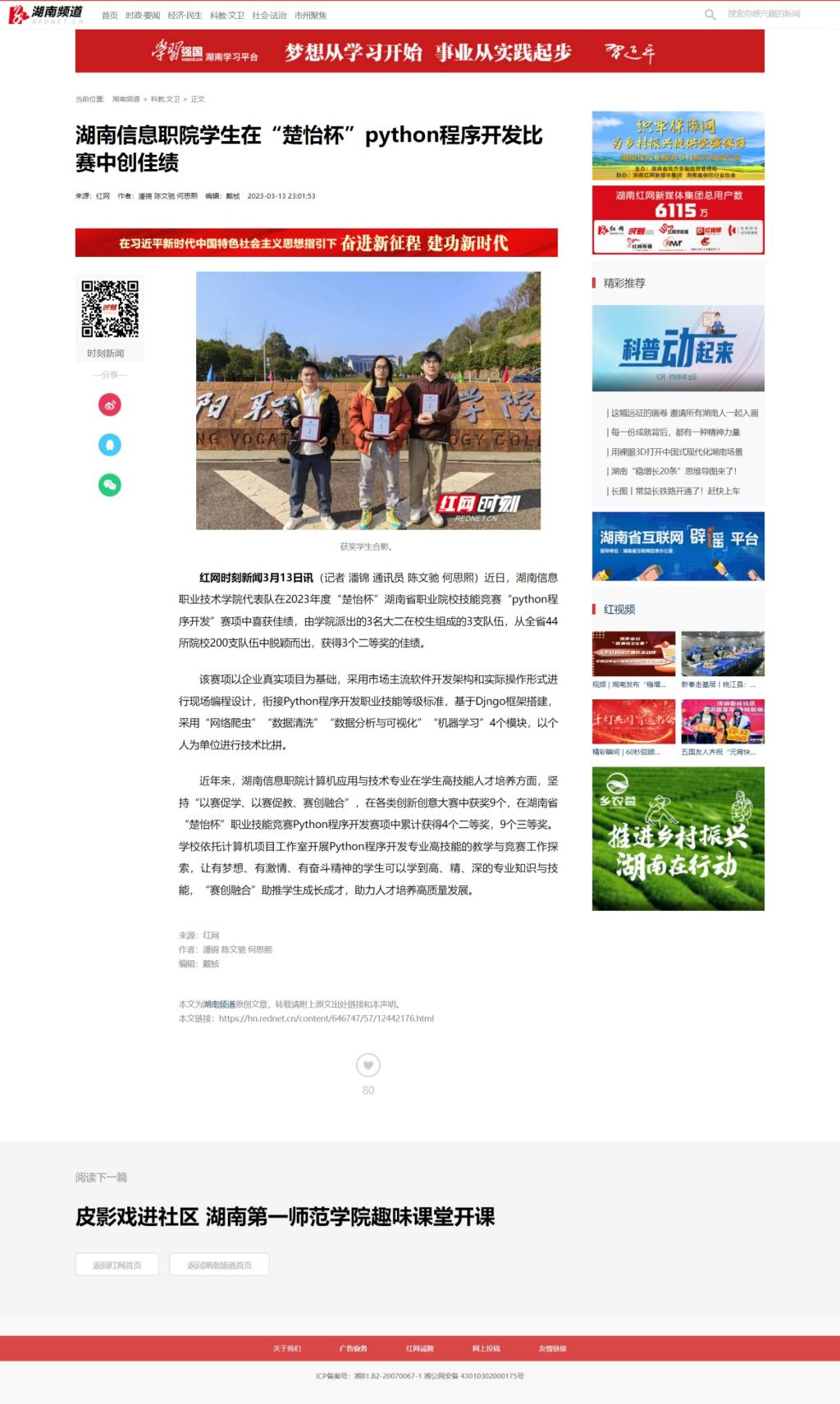 3月13日,红网发布《湖南信息职院学生在“楚怡杯”python程序开发比赛中创佳绩》