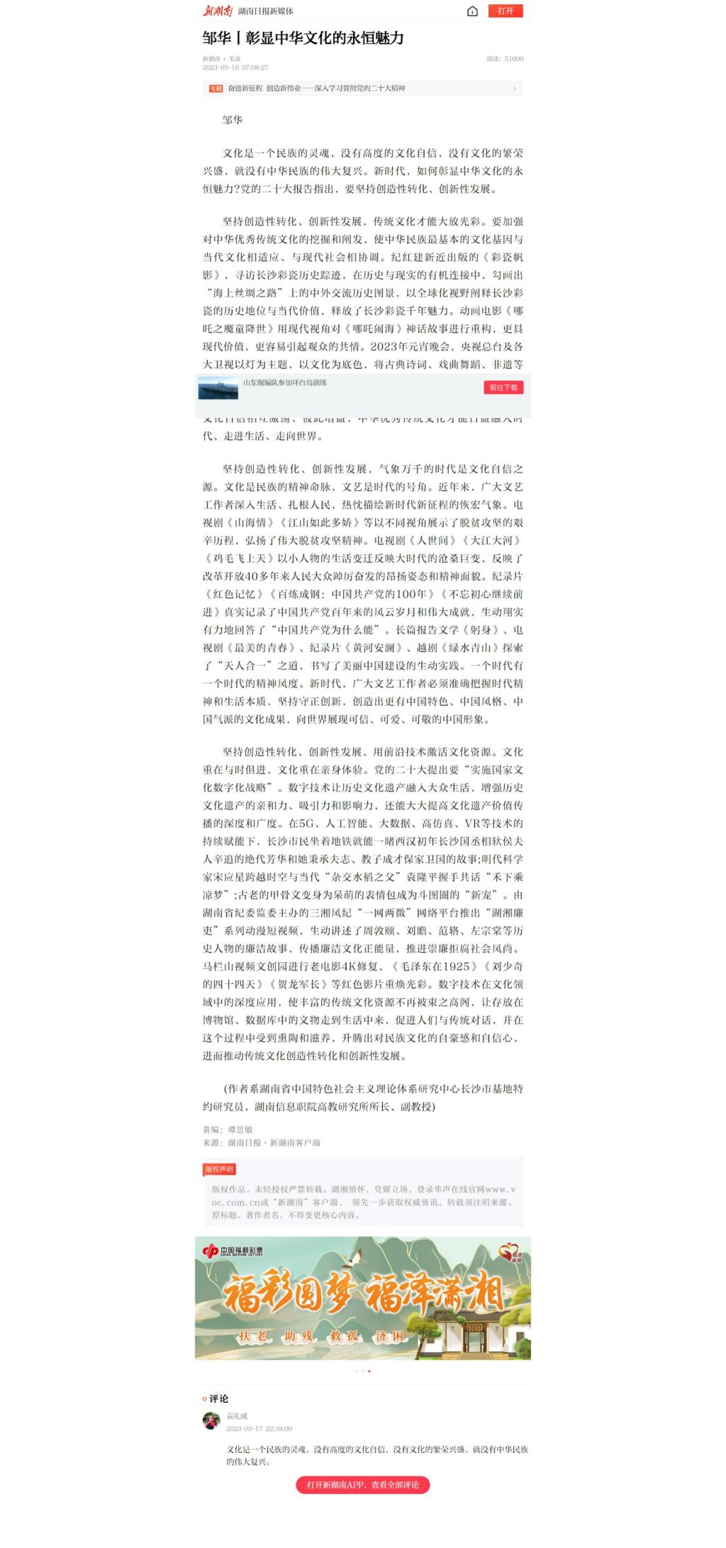 3月16日,新湖南客户端发布《深入学习贯彻党的二十大精神丨彰显中华文化的永恒魅力》