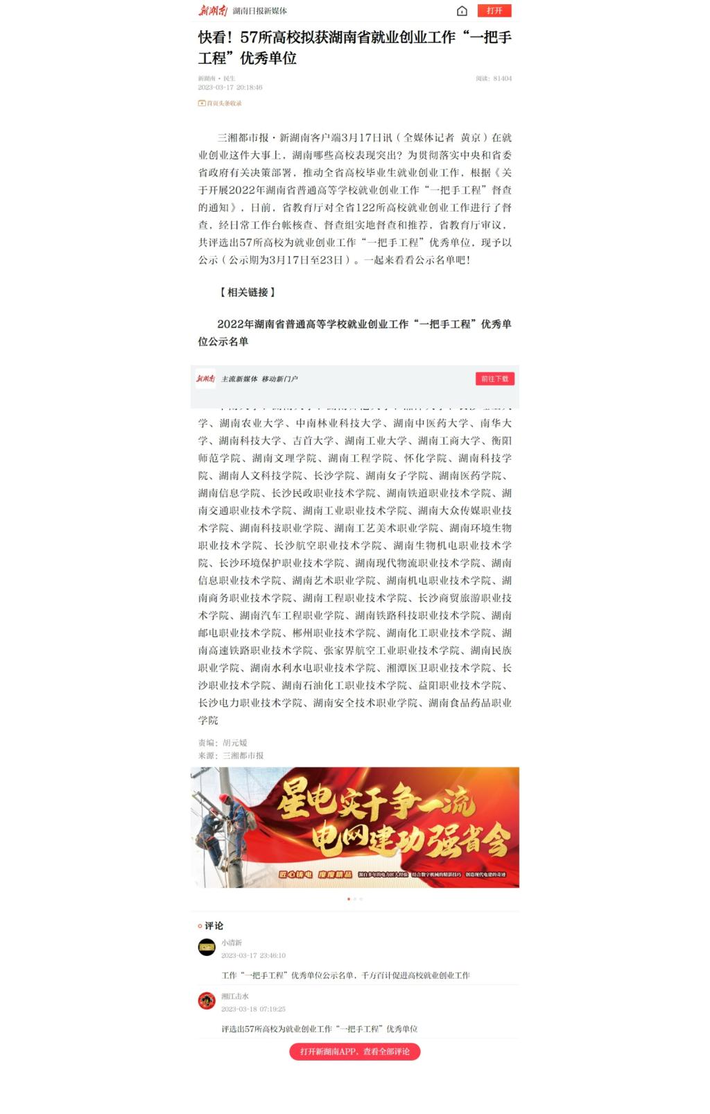 3月17日,新湖南客户端发布《快看!57所高校拟获湖南省就业创业工作“一把手工程”优秀单位》
