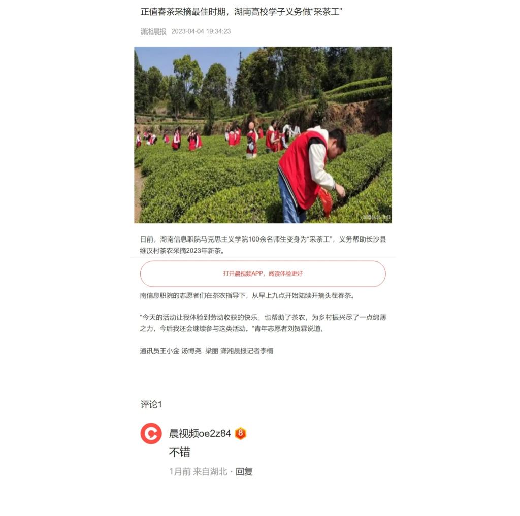 4月4日,晨视频发表《正值春茶采摘最佳时期,湖南高校学子义务做“采茶工”》