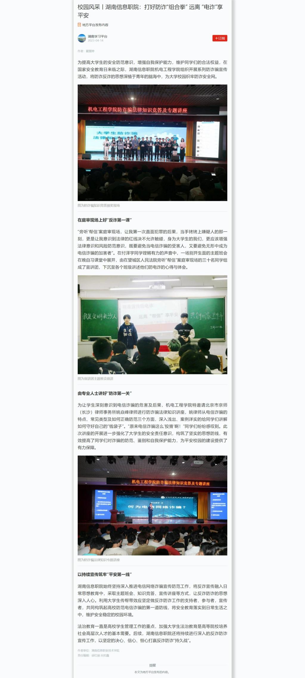 4月14日,学习强国发表《校园风采丨湖南信息职院:打好防诈“组合拳” 远离 “电诈”享平安》