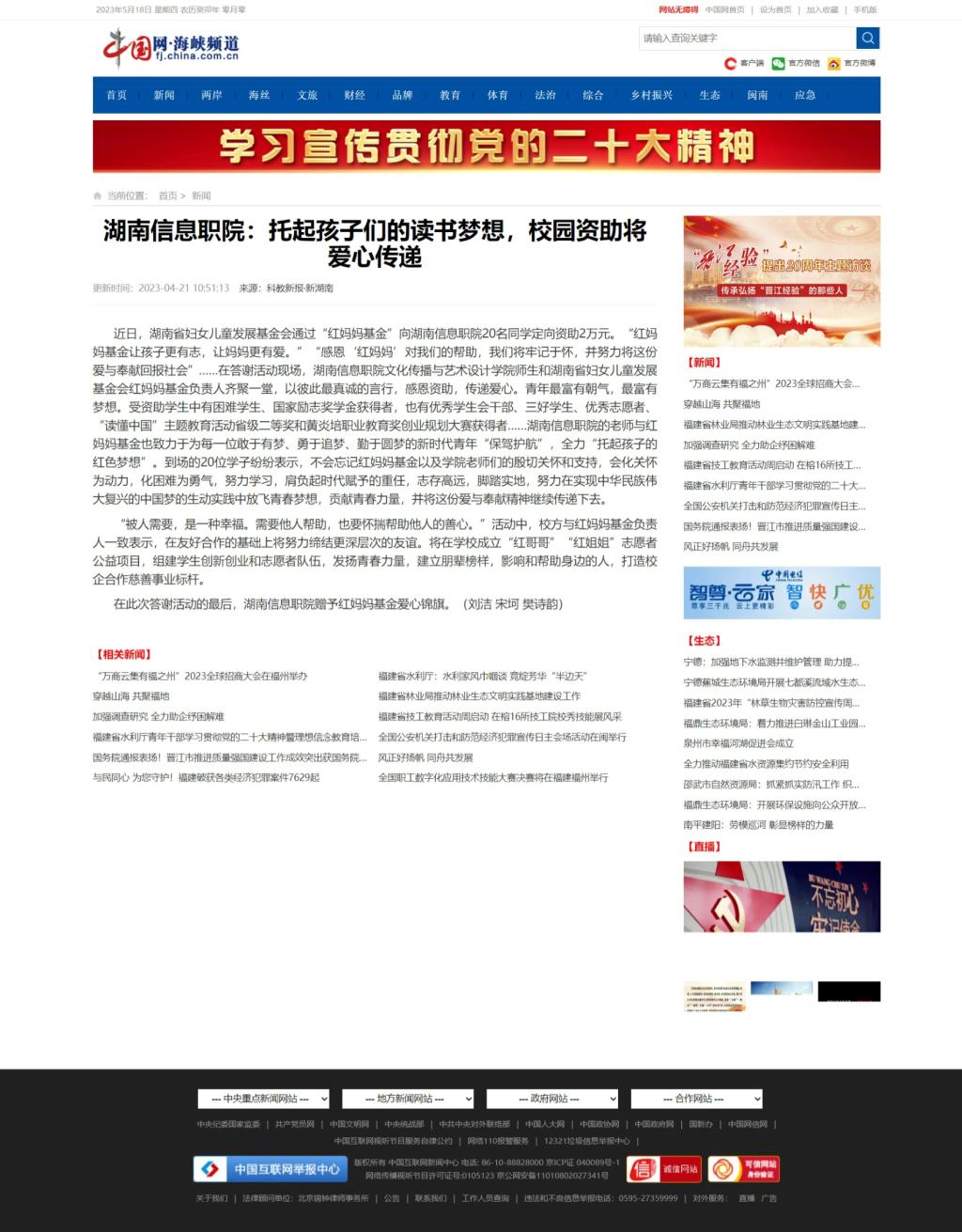 4月21日,中国网发表《湖南信息职院:托起孩子们的读书梦想,校园资助将爱心传递》