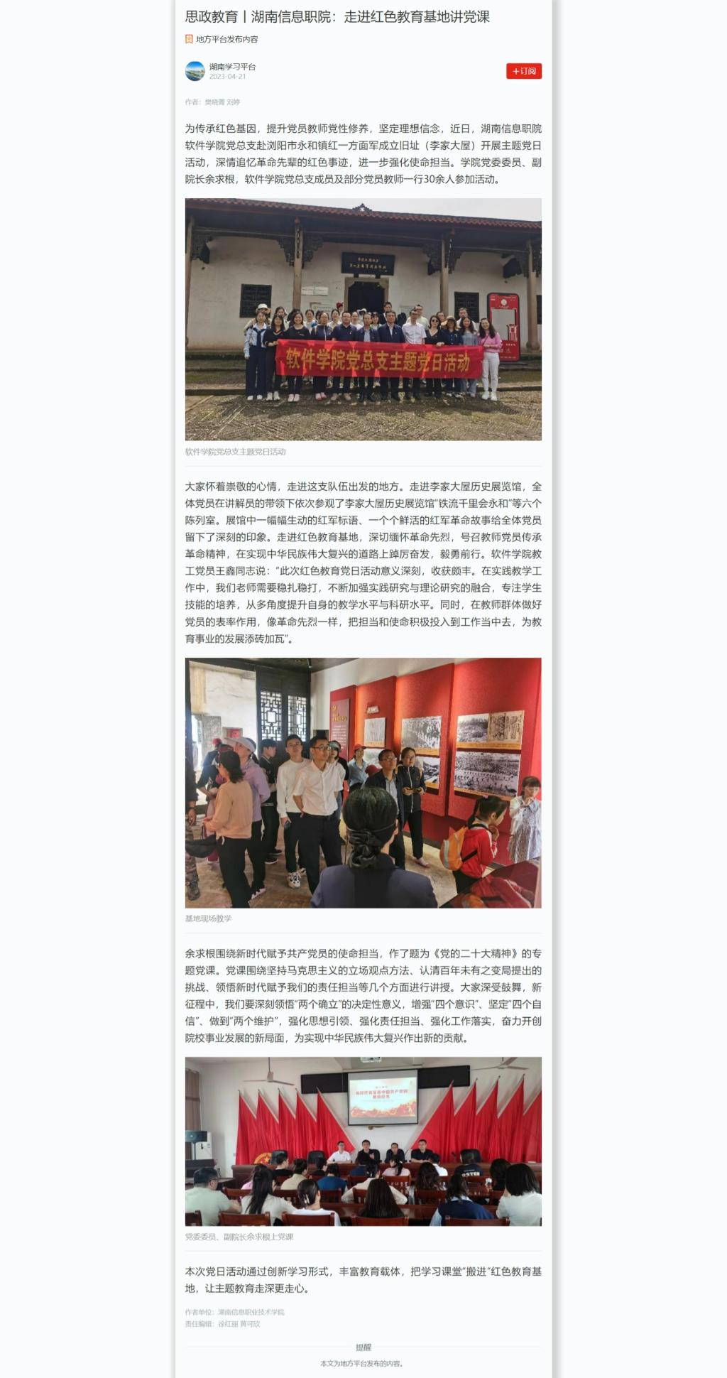 4月21日,学习强国发表《思政教育丨湖南信息职院:走进红色教育基地讲党课》
