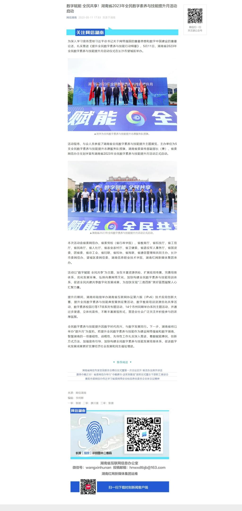 5月11日,微信(网信湖南)发布《数字赋能 全民共享!湖南省2023年全民数字素养与技能提升月活动启动》