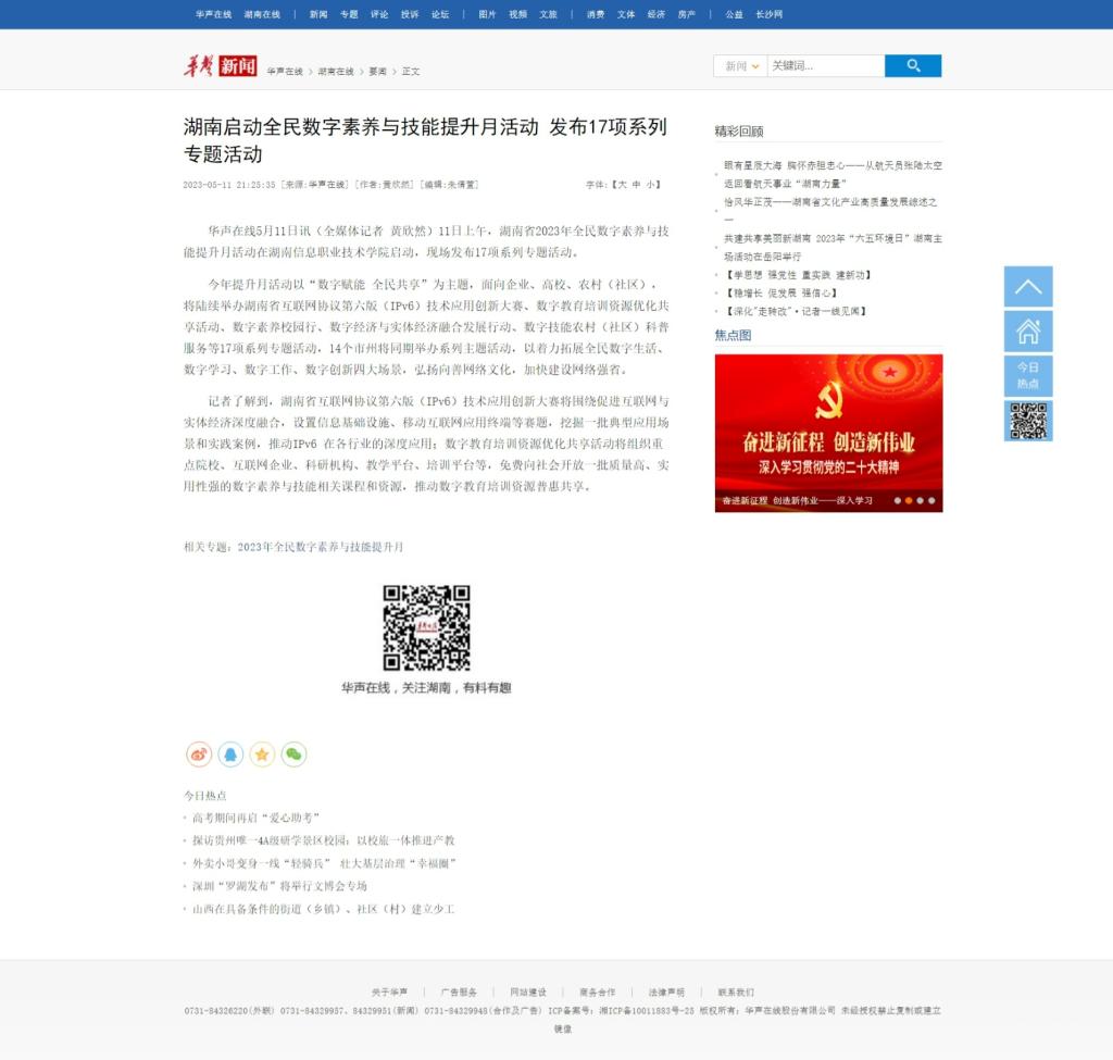 5月11日,华声在线发布《湖南启动全民数字素养与技能提升月活动 发布17项系列专题活动》
