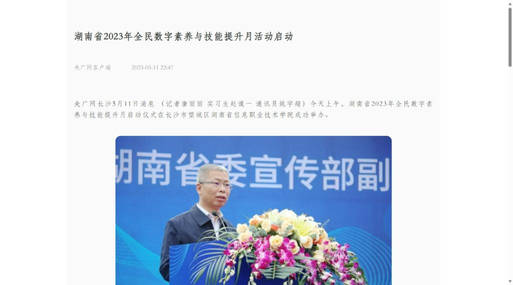 5月11日,央广网客户端发布《湖南省2023年全民数字素养与技能提升月活动启动》