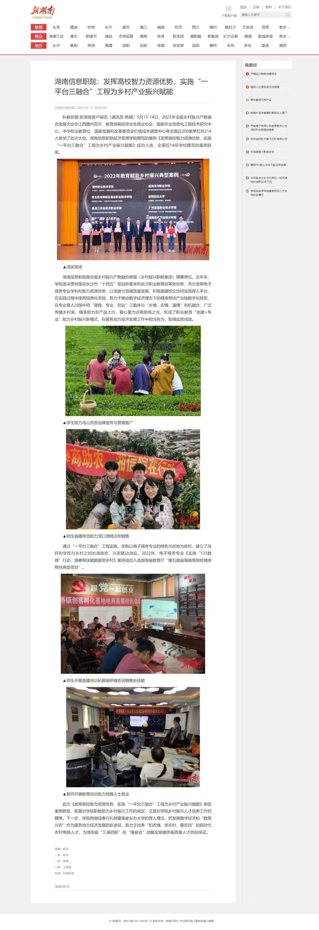 5月17日,新湖南发布《湖南信息职院:发挥高校智力资源优势,实施“一平台三融合”工程为乡村产业振兴赋能》