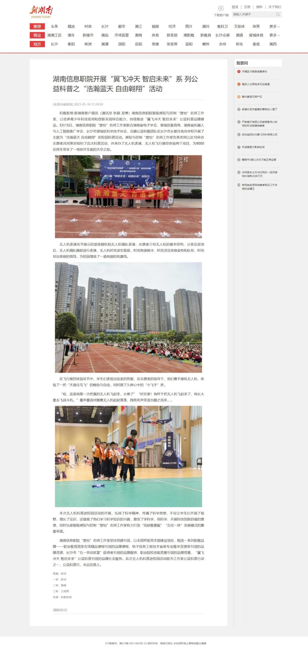 5月18日,新湖南发布《湖南信息职院开展“翼飞冲天 智启未来”系 列公益科普之“浩瀚蓝天 自由翱翔”活动》