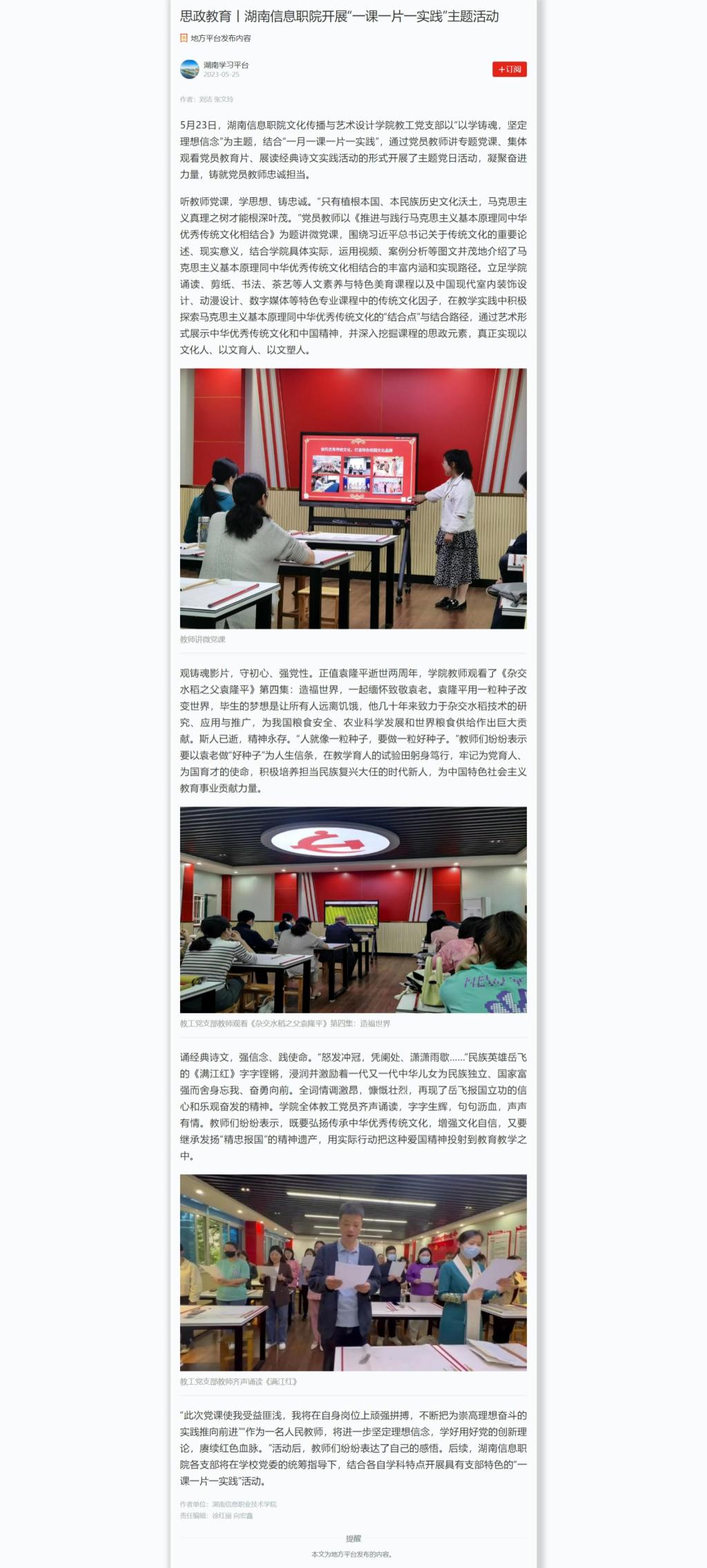 5月25日,学习强国发布《思政教育丨湖南信息职院开展“一课一片一实践”主题活动》